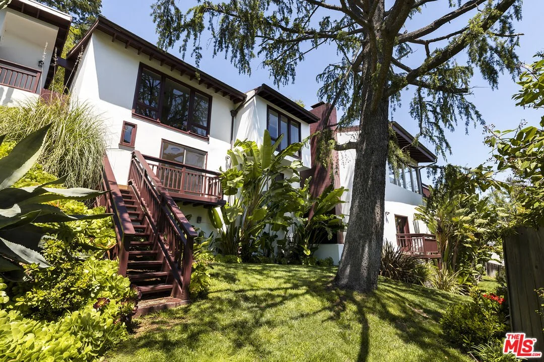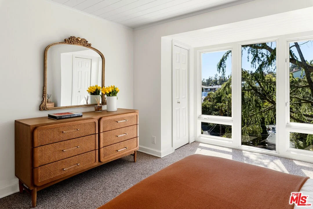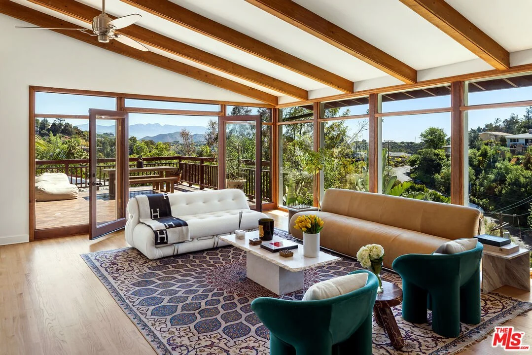 Welcome to an exquisite, Fully Furnished Mid-Century residence tucked away in Laurel Canyon behind a private gate, at the end of a quiet cul-de-sac. Boasting a spacious living area with vaulted ceilings and panoramic views of the Hollywood sign, this unique home offers an inviting atmosphere flooded with natural light. The kitchen features state-of-the-art appliances, seamlessly flowing into the adjacent dining space and providing direct access to the outdoor patio. Retreat to the luxurious Primary suite, complete with a spacious en suite bathroom featuring dual sinks and ample closet space. A well-appointed Guest Bedroom and updated bathroom are conveniently located across from the generously sized laundry room equipped with new washer/dryer units. Descend the spiral staircase to discover the Third Bedroom, with its own en suite bath and direct access from the backyard, with a sprawling lawn, terraced garden, and newly installed outdoor/motion lighting. Additionally, there is a separate studio space, which can be used as a home gym, office, playroom, or theater. With updated plumbing and electrical systems throughout, this home ensures modern comfort and convenience. Parking is a breeze with a 2-car garage and ample driveway space. Located in the coveted Wonderland School District, this residence embodies the epitome of California living, offering a harmonious blend of style, comfort, and privacy.